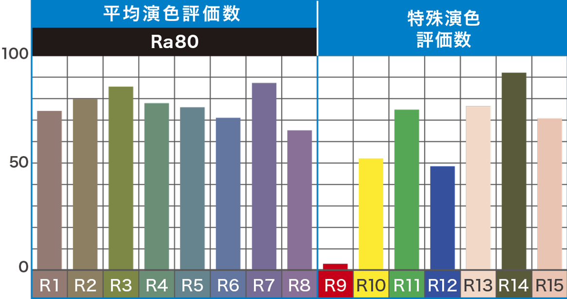 忠実な色味の再現性を必要とする色評価用光源にはRaだけでなく、R9~R15などの特殊演色評価数も高い性能が要求されます。エコリカでは青色LEDでは再現が難しい赤(R9)や日本人の肌色(R15)などキーとなる色味においてAAA蛍光ランプ以上の再現性を実現しております。