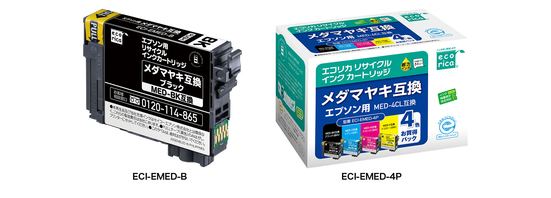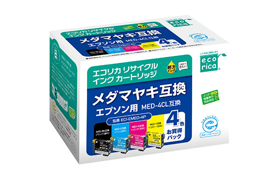 株式会社エコリカ(本社:大阪市中央区、代表取締役社長:宗廣宗三)では、2025年11月21日にエプソンプリンター用メダマヤキ互換リサイクルインクカートリッジからブラック単品(顔料ブラック)と4色BOX品(顔料ブラック、染料シアン、染料マゼンタ、染料イエロー)を発売いたします。